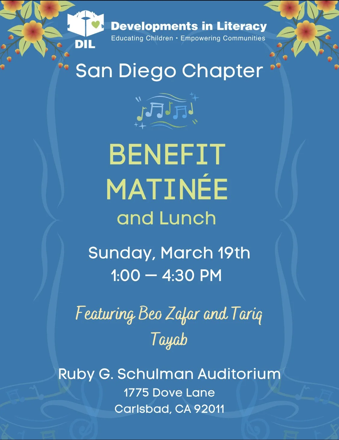 Join us for DIL San Diego’s Benefit Matinée and Lunch on Sunday, March 19th at the Carlsbad City Library! Details are below in the flyer. Get your tickets today:
